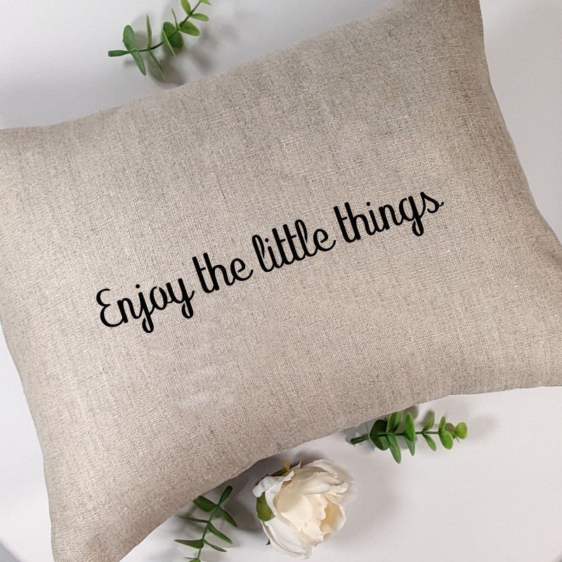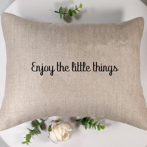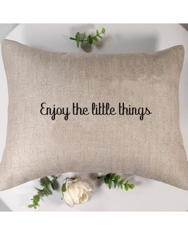 Hoousse de coussin en lin naturel avec la citation "Enjoy the little things" floquée en noir.