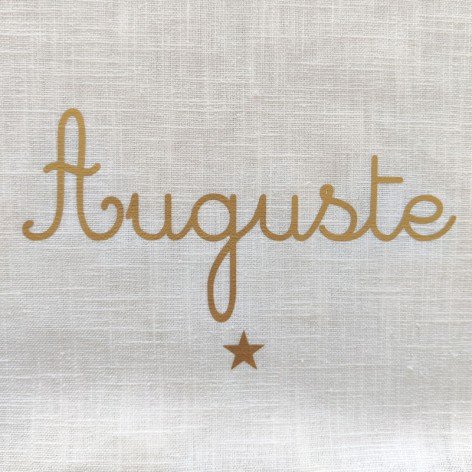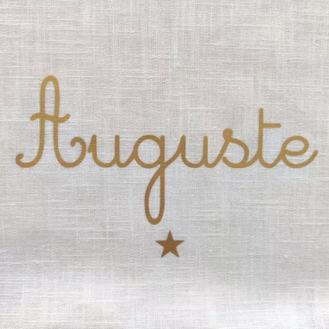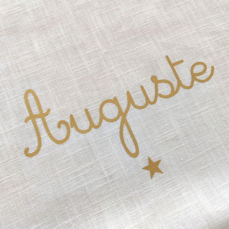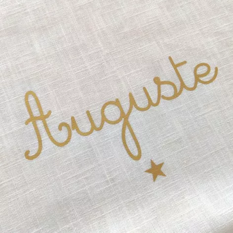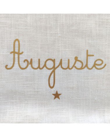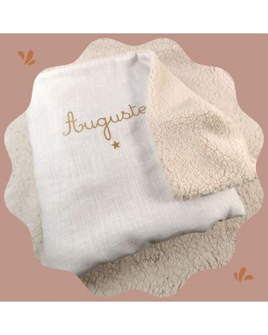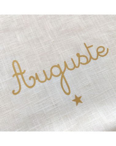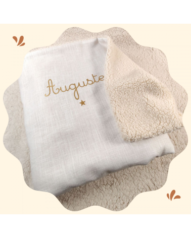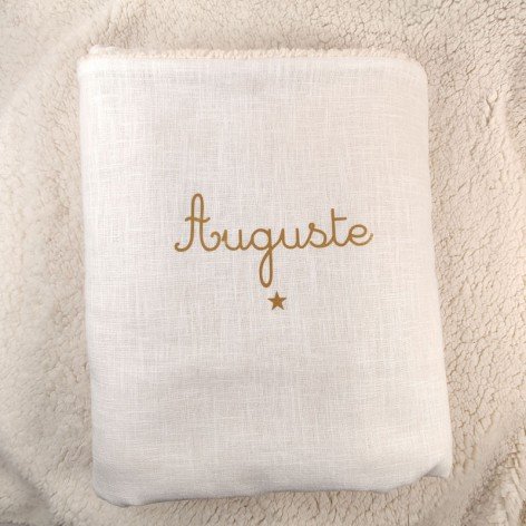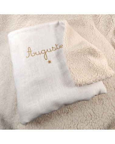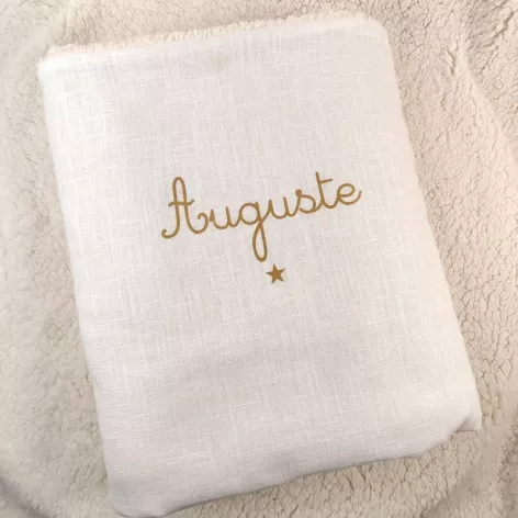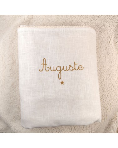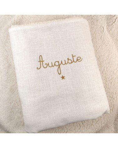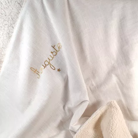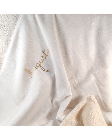 Couverture de baptême personnalisée en double gaze de coton ivoire, avec le prénom doré et un motif au choix.