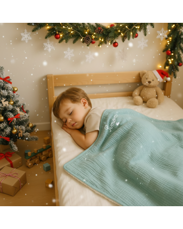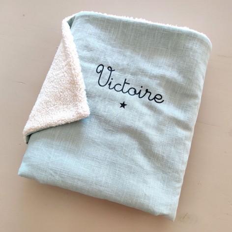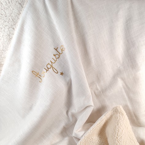 Nous avons créé une couverture en double gaze et sherpa qui associe douceur, chaleur et personnalisation.