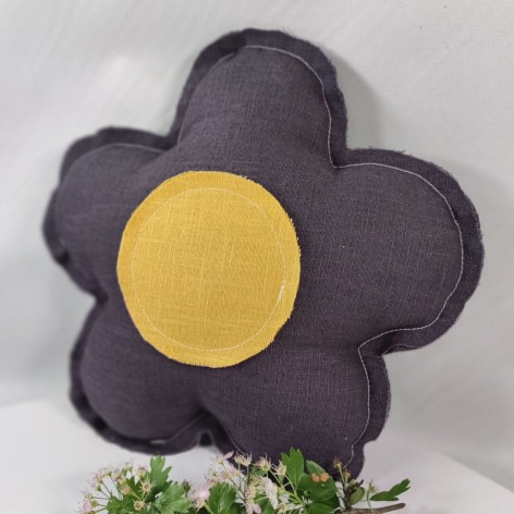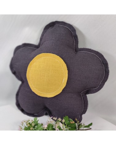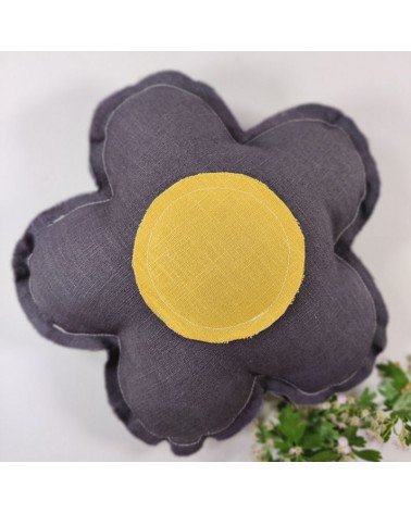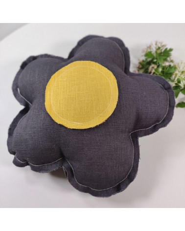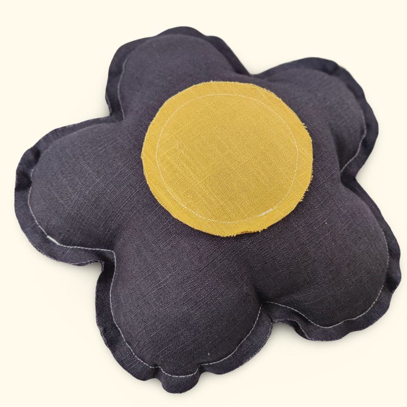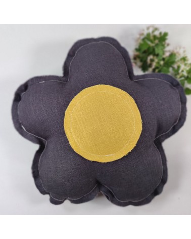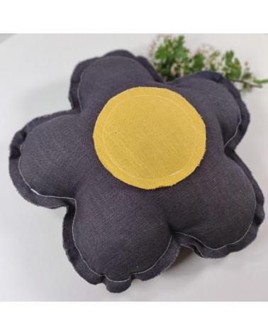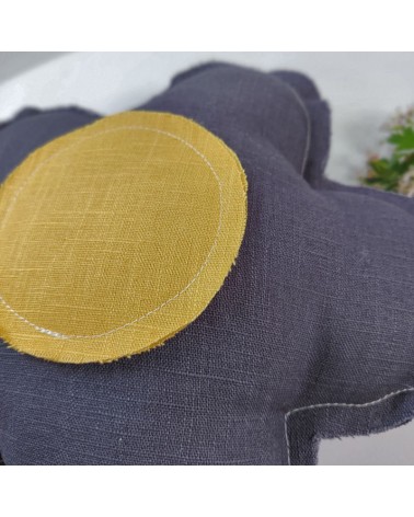 Ce coussin pour enfant en forme de fleur est réalisé en lin bleu, avec le coeur en lin moutarde.