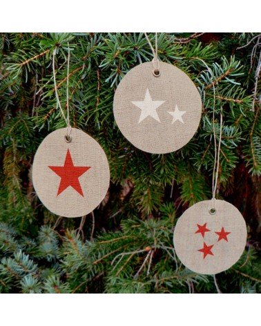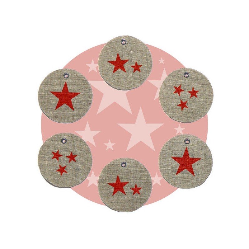 Lot de 6 étiquettes en lin rondes avec des étoiles peintes au pochoir, couleur au choix. Lin coloris naturel. Diamètre 7 cm.