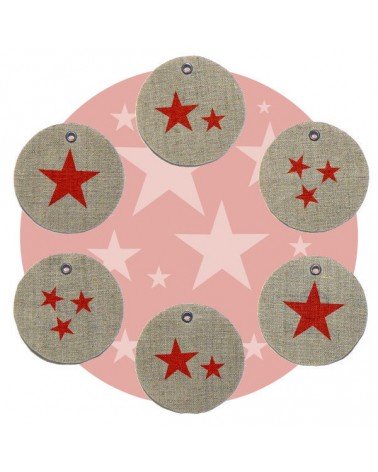 Lot de 6 étiquettes en lin rondes avec des étoiles peintes au pochoir, couleur au choix.