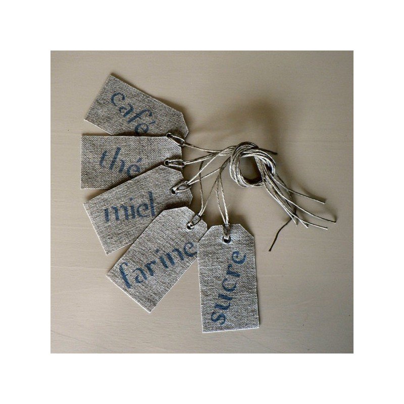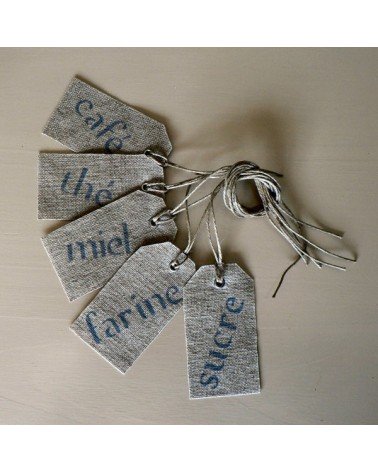 Lot de 5 étiquettes en lin portant les inscriptions sucre, farine, miel, thé, café peintes au pochoir, couleur au choix. Lin coloris naturel. Dimensions 9x5 cm.
