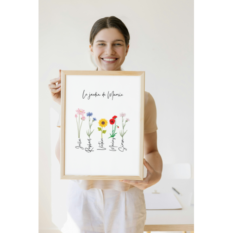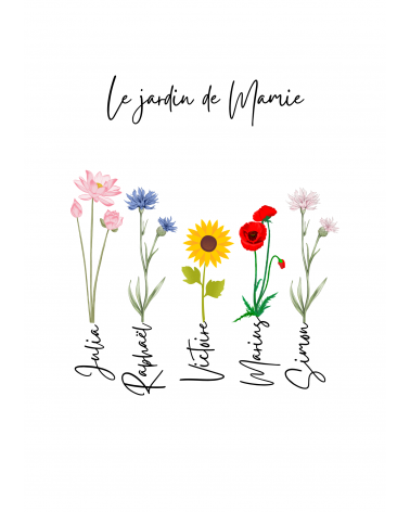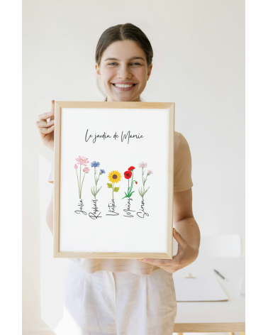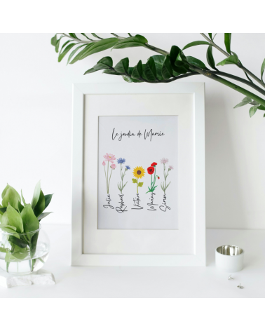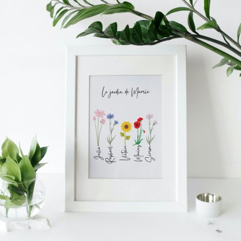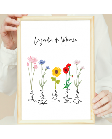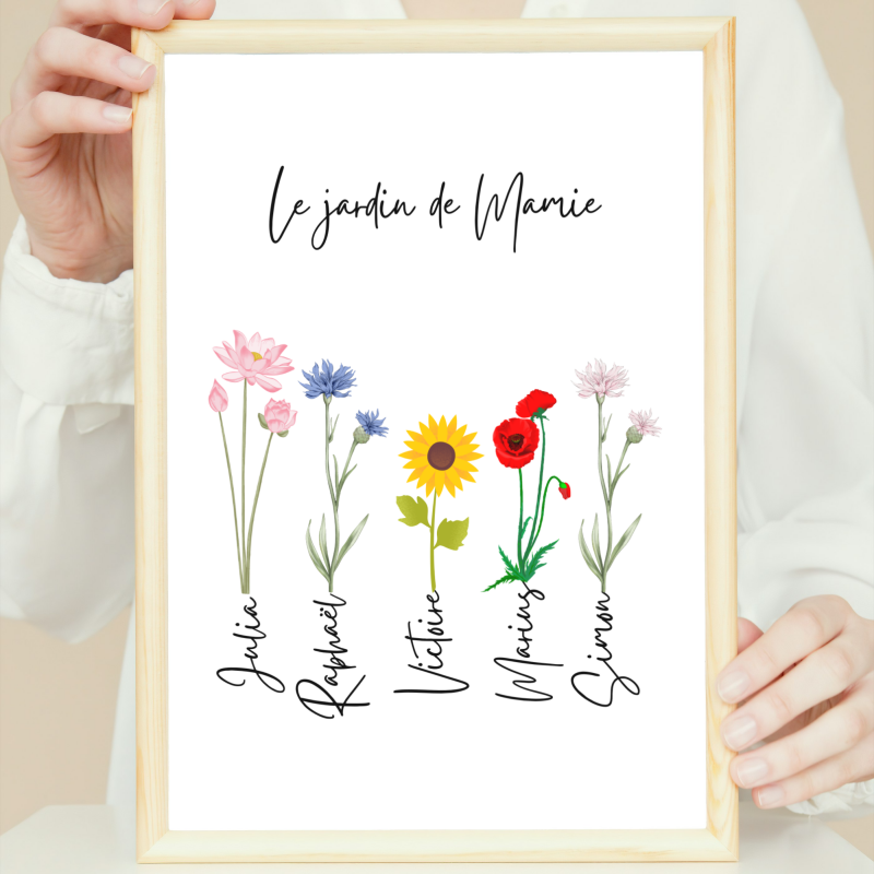 Affiche numérique personnalisée "Le jardin de Mamie" avec les prénoms de ses petits enfants.
