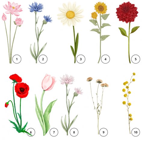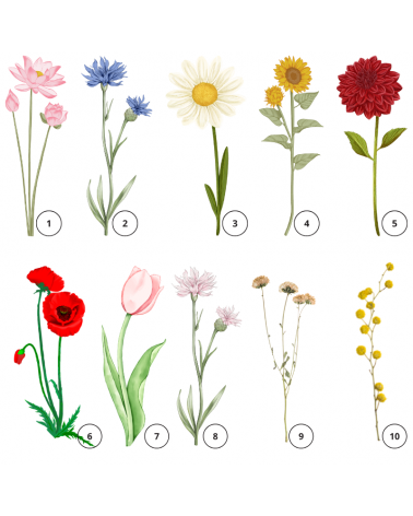 Vous pouvez également choisir la fleur à associer à chaque prénom, que vous indiquerez également dans le cadre "personnalisation".
