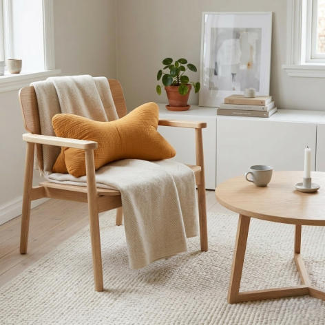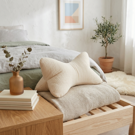 Coussin de lecture avec 2 faces en double gaze de coton coloris vert céladon, et une face en fausse fourrure sherpa écrue toute douce.