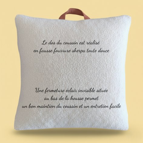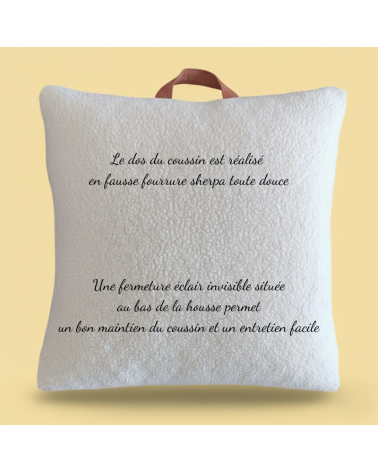 Le coussin de 30x40 cm ou 40x40 cm avec sa poignée de transport, pièce maîtresse de ce kit, est à la fois douillet et pratique. Il est réalisé en double gaze de coton délicate avec le dos en sherpa. Il est déhoussable pour un entretien aisé et une hygiène parfaite. De plus, une poignée pratique est intégrée pour faciliter le transport du coussin et permettre aux enfants de l'accrocher facilement au porte-manteau de l'école.