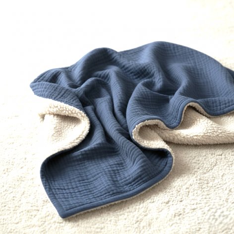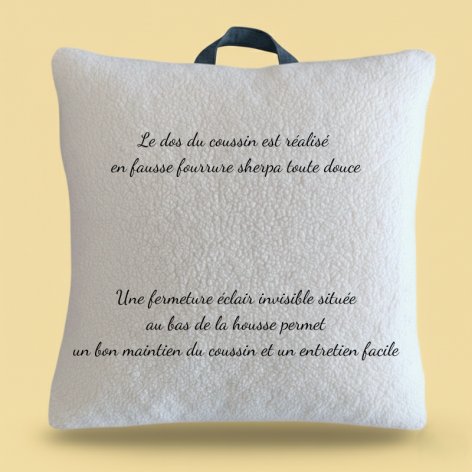 - Coussin complet (housse + garniture intérieure) en double gaze de coton bleu jean avec dos en sherpa, de 30x40 cm ou 40x40 cm, avec poignée de transport et personnalisable.