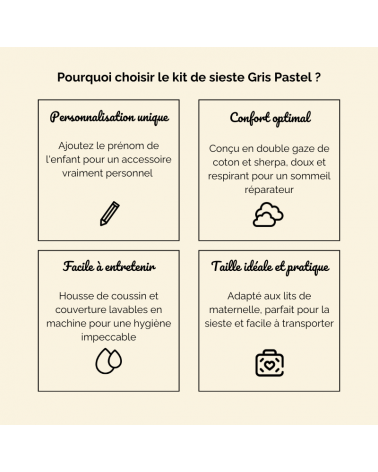 Ce qui rend notre kit de sieste vraiment unique, c'est sa personnalisation. Vous pouvez choisir d'ajouter le nom de votre enfant, le rendant ainsi unique et spécial.