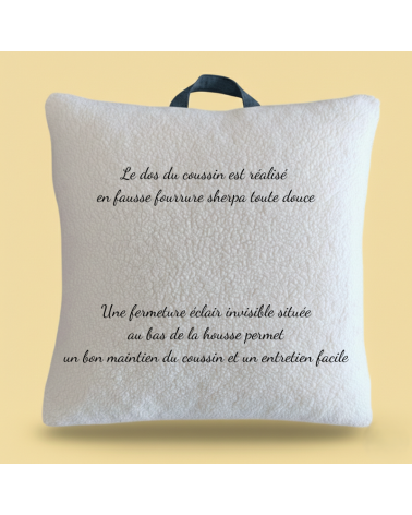 Le coussin de 30x40 cm ou 40x40 cm avec sa poignée de transport, pièce maîtresse de ce kit, est à la fois douillet et pratique. Il est réalisé en double gaze de coton délicate avec le dos en sherpa. Il est déhoussable pour un entretien aisé et une hygiène parfaite. De plus, une poignée pratique est intégrée pour faciliter le transport du coussin et permettre aux enfants de l'accrocher facilement au porte-manteau de l'école.