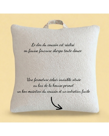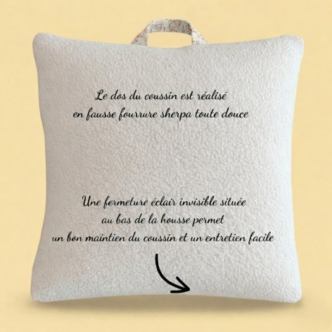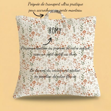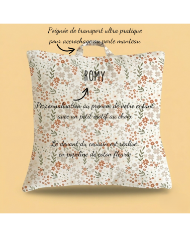 Le coussin de 30x40 cm ou 40x40 cm avec sa poignée de transport, pièce maîtresse de ce kit, est à la fois douillet et pratique. Il est réalisé en popeline de coton fleurie avec le dos en sherpa. Il est déhoussable pour un entretien aisé et une hygiène parfaite. De plus, une poignée pratique est intégrée pour faciliter le transport du coussin et permettre aux enfants de l'accrocher facilement au porte-manteau de l'école.