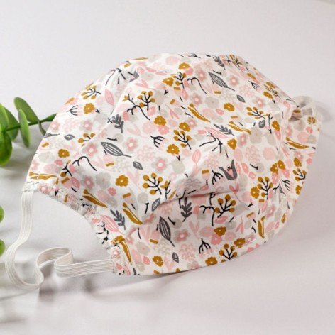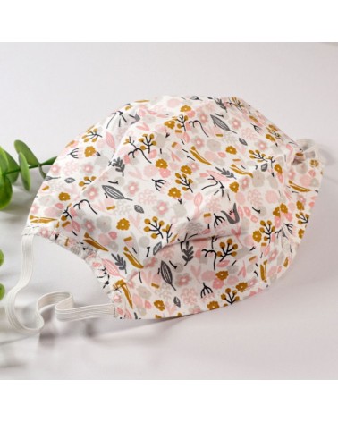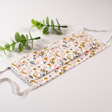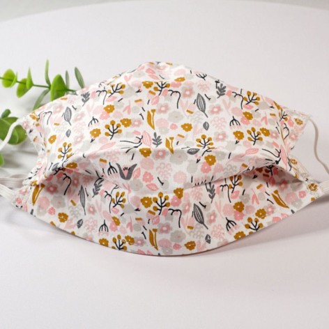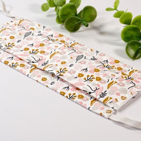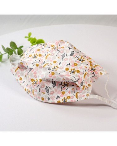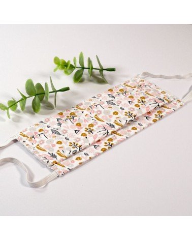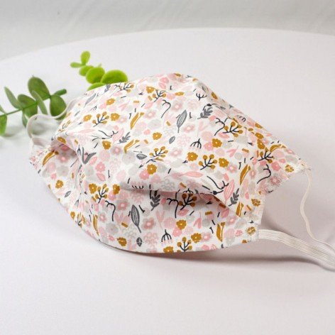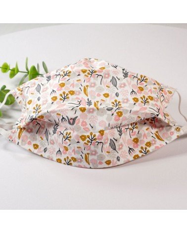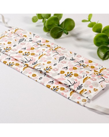 Masque de protection lavable en coton, réalisé avec une face en coton fleuri, et une face en coton blanc (intérieur).