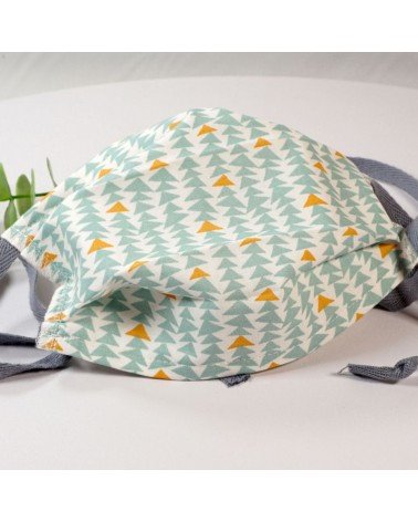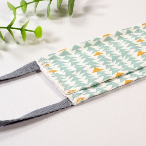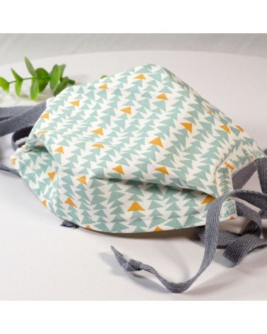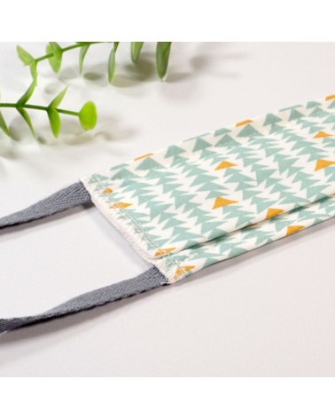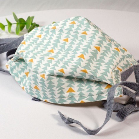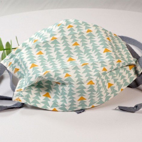 Masque de protection lavable en coton, réalisé avec une face en coton à motifs triangles, et une face en coton blanc (intérieur).