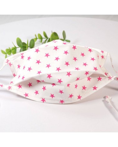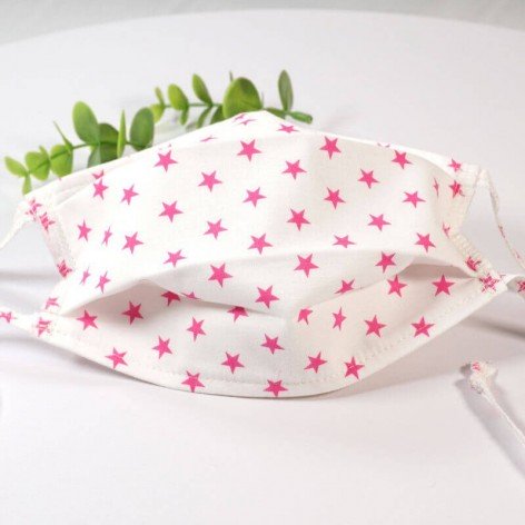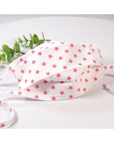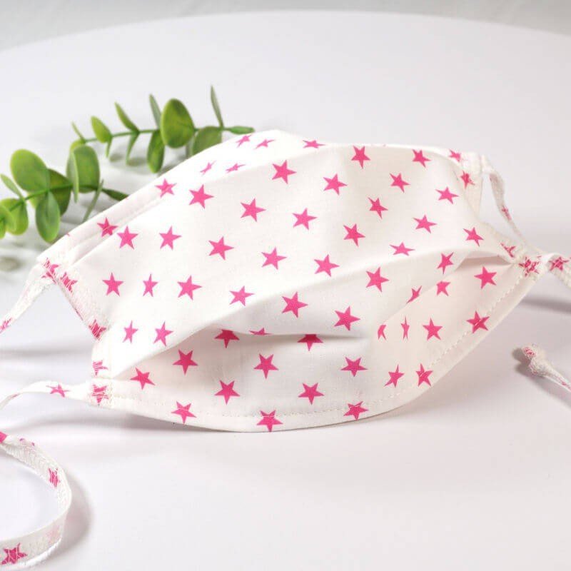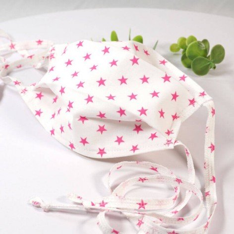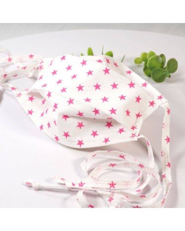 Masque barrière lavable en tissu de coton, réalisé avec une face en coton étoilé, et une face en coton blanc (intérieur).