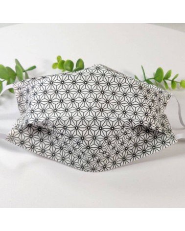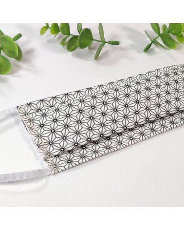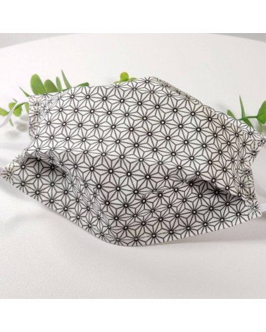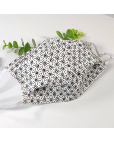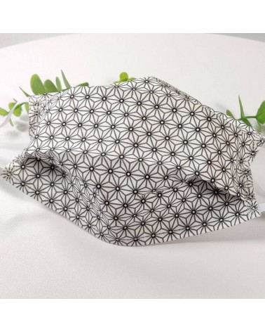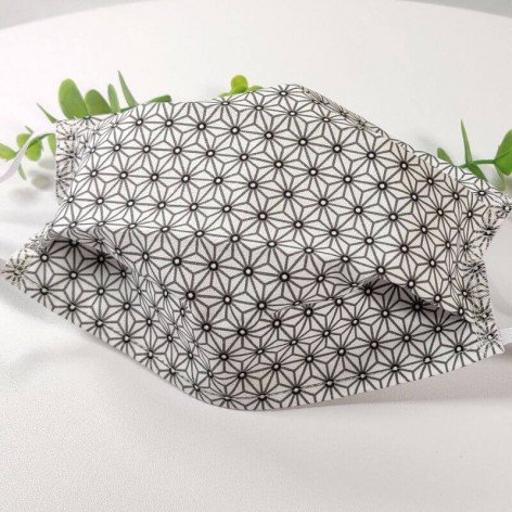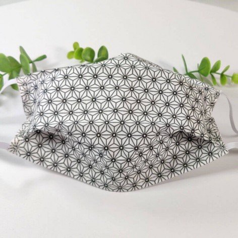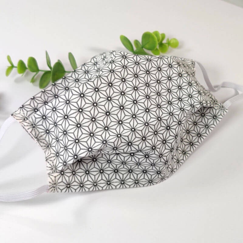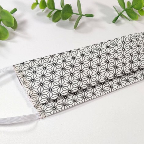 Masque barrière lavable en tissu de coton, réalisé avec une face en coton à motifs géométriques, et une face en coton blanc (intérieur).