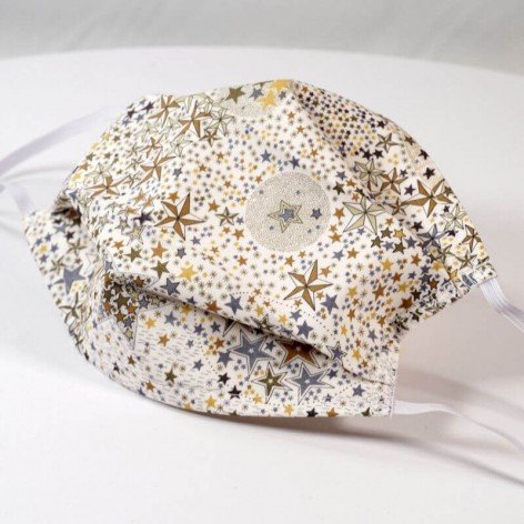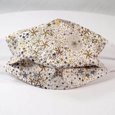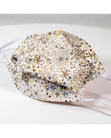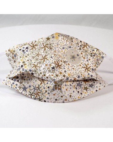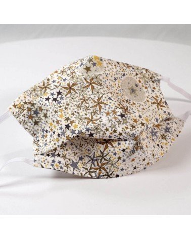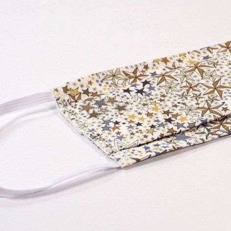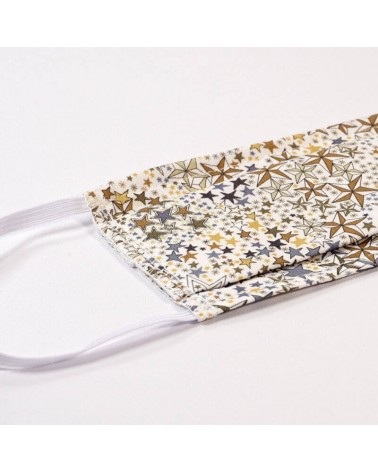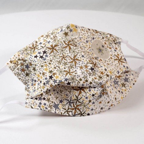 Masque barrière lavable en tissu de coton, réalisé avec une face en Liberty à motifs étoilés, et une face en coton blanc (intérieur).