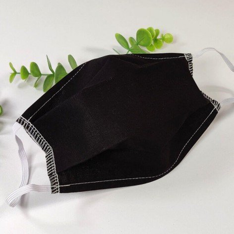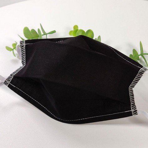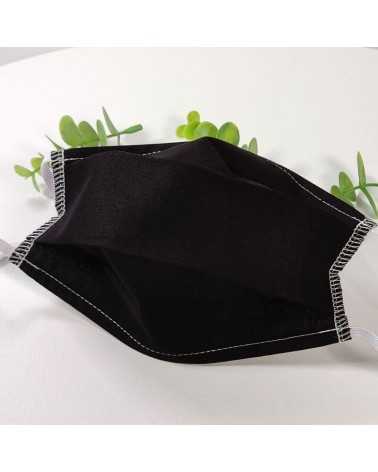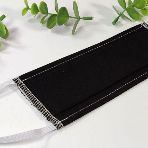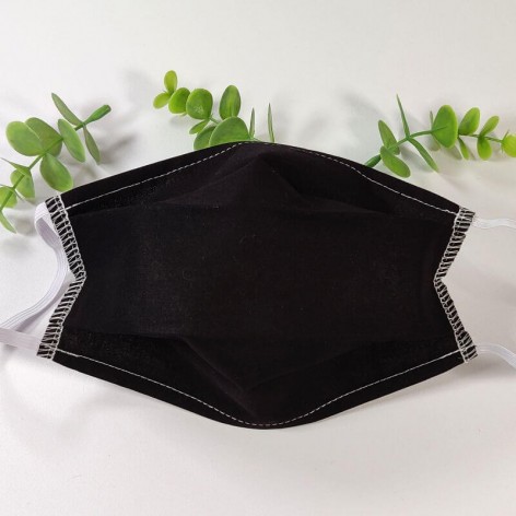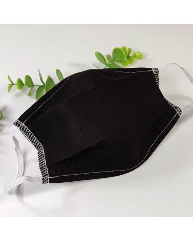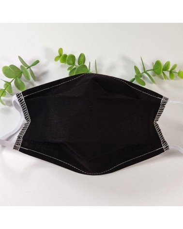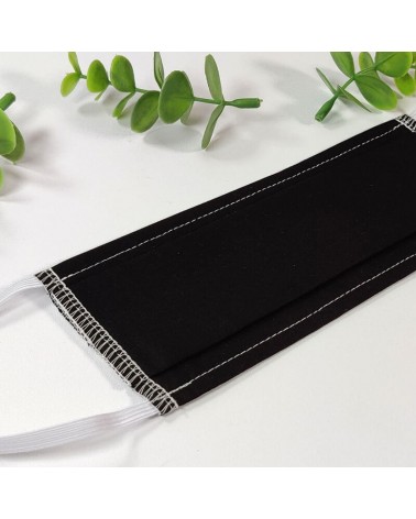 Masque barrière lavable en tissu de coton, réalisé avec une face en coton noir, et une face en coton blanc (intérieur).