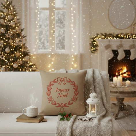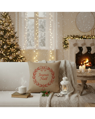 Magnifique coussin en lin naturel, avec un motif de couronne de Noël et inscription Joyeux Noël floqué en rouge.
