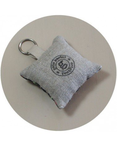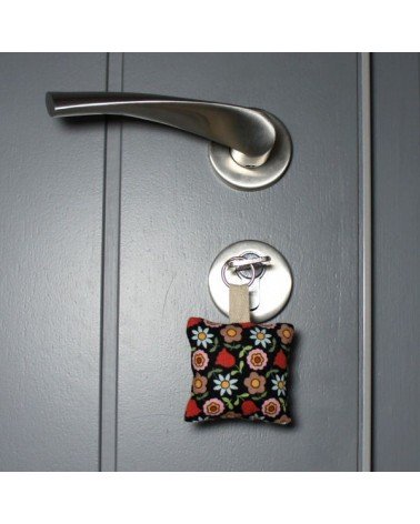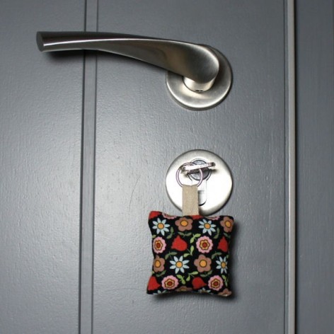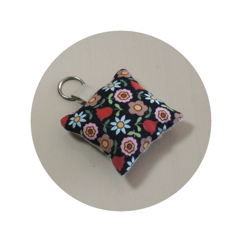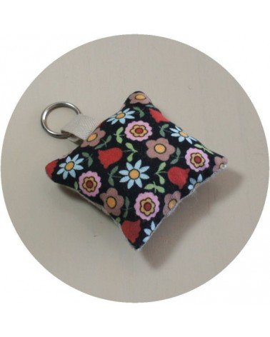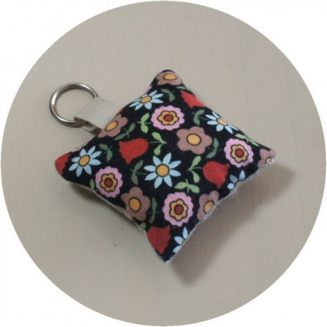 Porte-clé en lin et coton, un côté coton fond noir et fleurettes, dos en lin naturel.