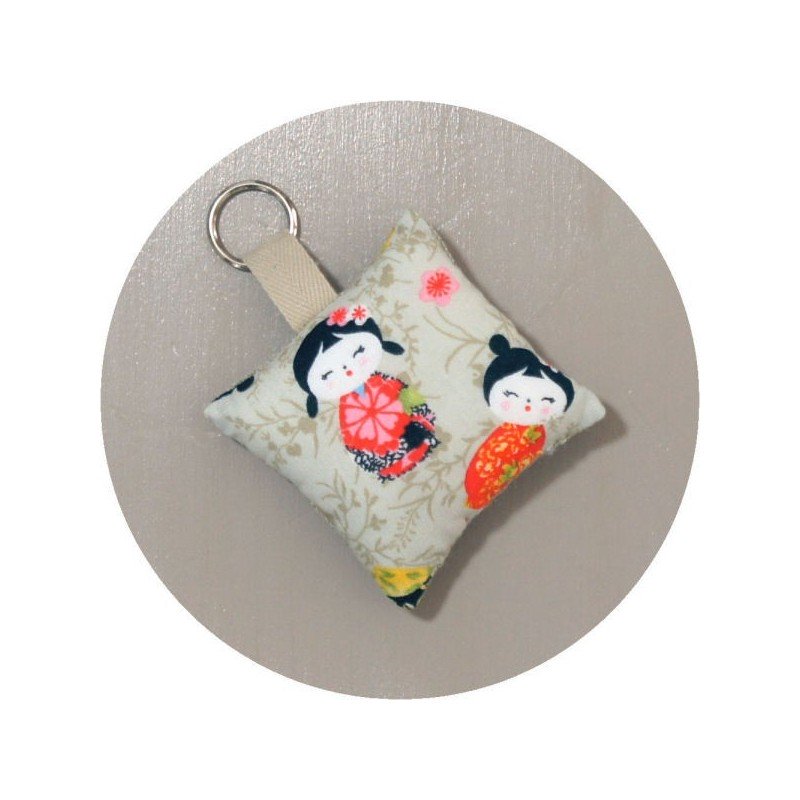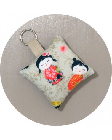Accessoires indispensables, nos porte-clés se déclinent dans de nombreux coloris et motifs : celui-ci est en lin et coton imprimé de petites geishas colorées.