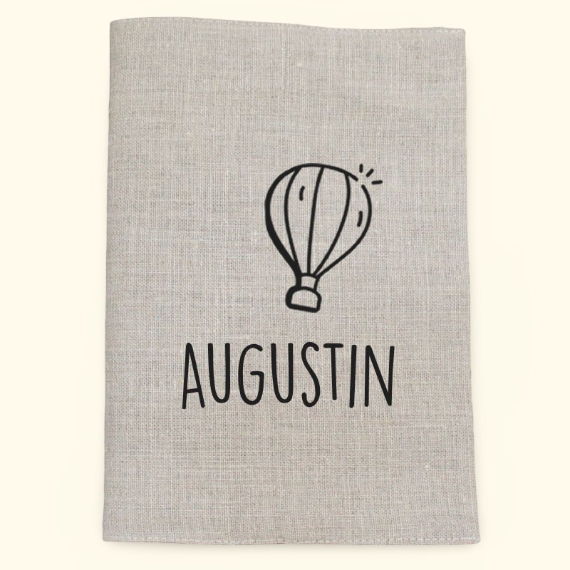 Le protège carnet de santé est personnalisé avec le prénom de bébé et décoré d'une montgolfière.