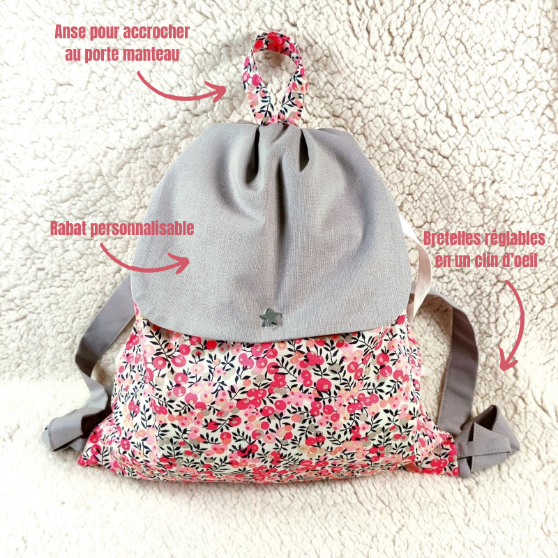 Fermeture astucieuse : Le sac se ferme par un lien coulissant, permettant une ouverture facile pour les petits doigts. Le rabat, personnalisable selon vos préférences, ajoute une touche unique à chaque sac, se fermant élégamment avec un bouton-pression en forme d'étoile.