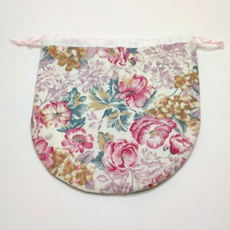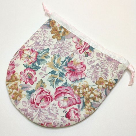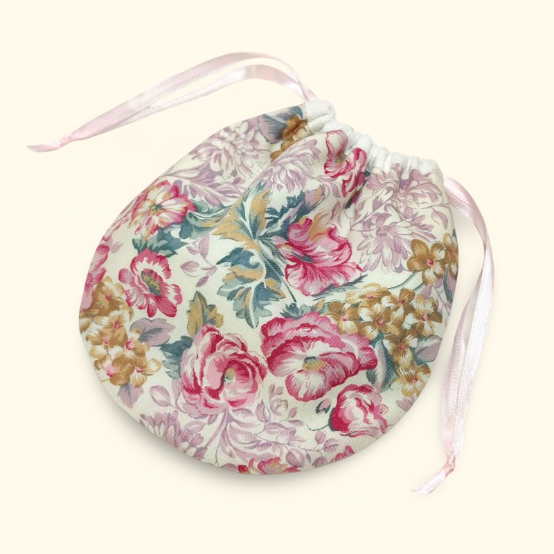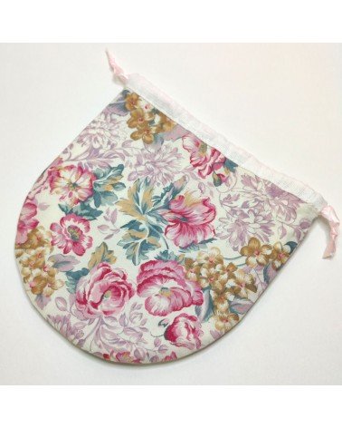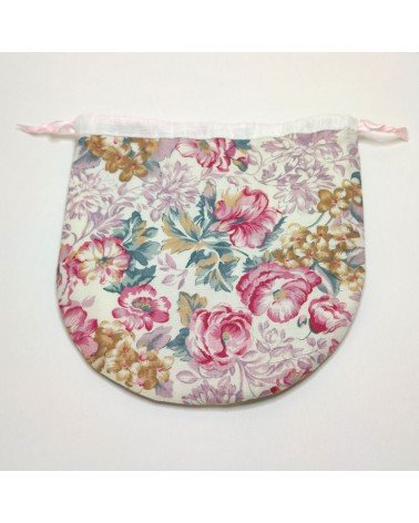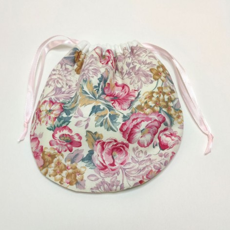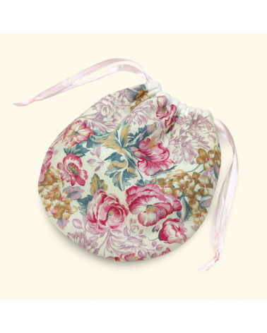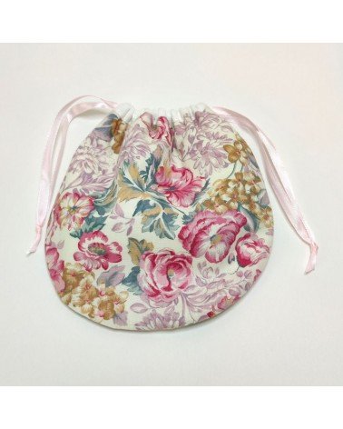 Petite pochette à bijoux ronde, en coton fleuri et doublée en lin ivoire.