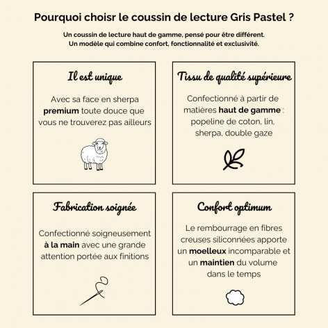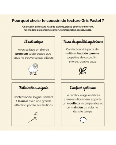 Contrairement aux coussins de lecture standard, le coussin Gris Pastel se distingue par sa qualité supérieure et sa longévité. Sa fabrication artisanale en fait un objet d’exception, idéal pour ceux qui recherchent l’authenticité et la durabilité.