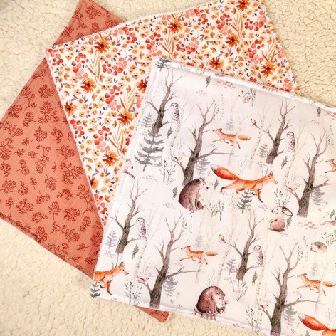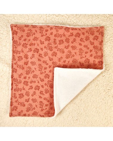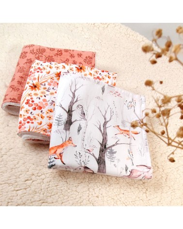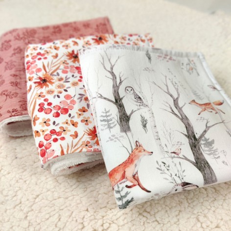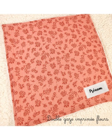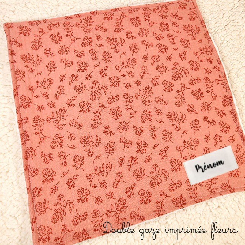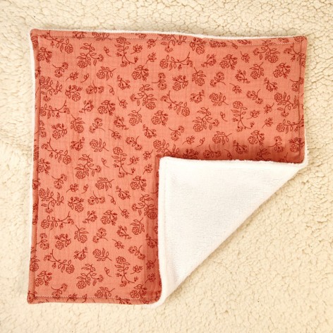 Le devant est réalisé en double gaze de coton imprimée de fleurs et feuilles, le dos est en éponge bambou blanche toute douce et surtout super absorbante !