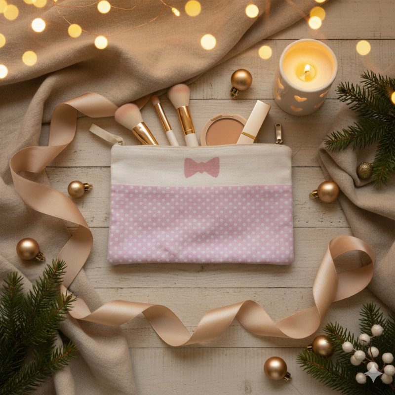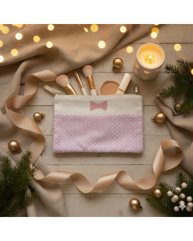 Pochette en coton rose/mauve à pois blancs avec un empiècement en lin blanc.