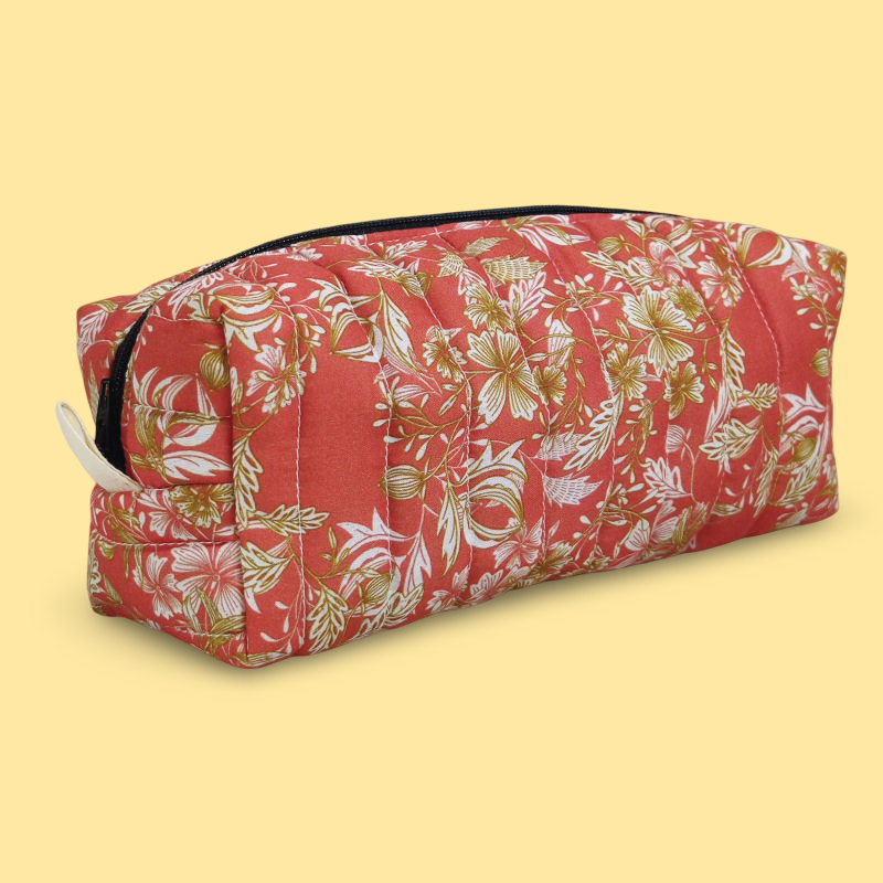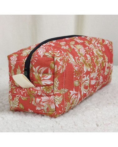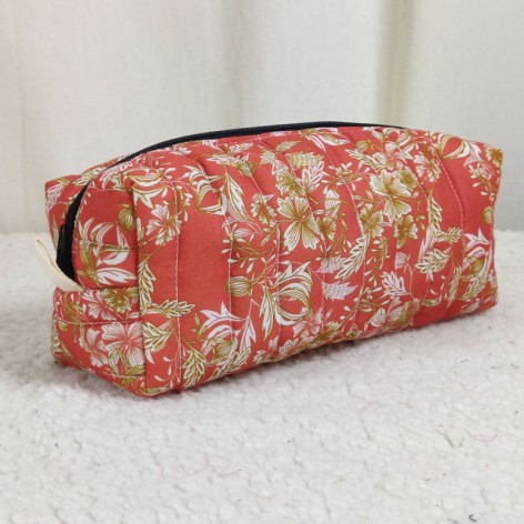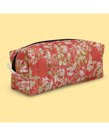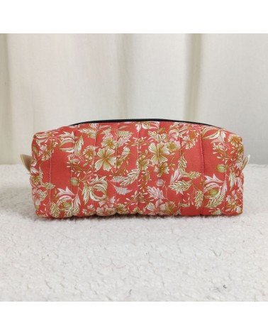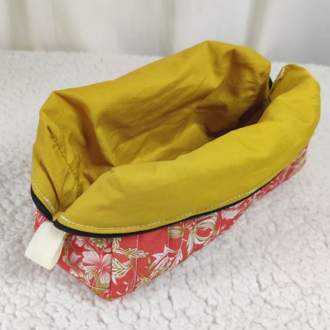Trousse de toilette matelassée en coton fleuri et doublée en coton moutarde.