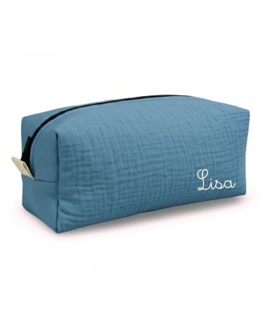 N'oubliez pas d'enregistrer vos choix pour pouvoir ajouter au panierTrousse de toilette molletonnée en double gaze de coton bleu jean, personnalisable avec un prénom (flocage blanc).