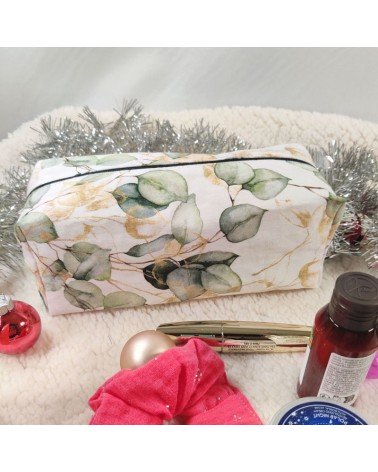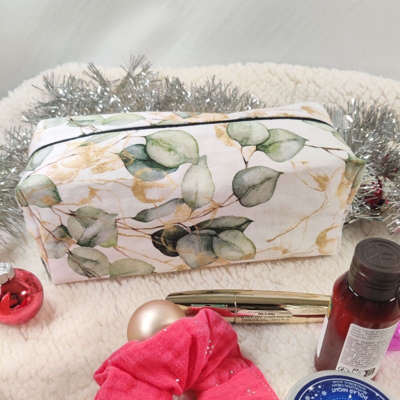 Une jolie trousse de toilette en coton imprimé "eucalyptus", doublée en lin ivoire.