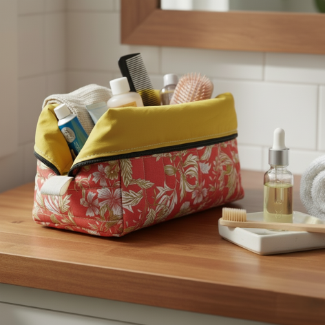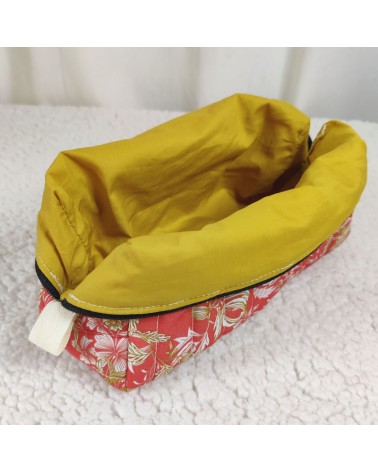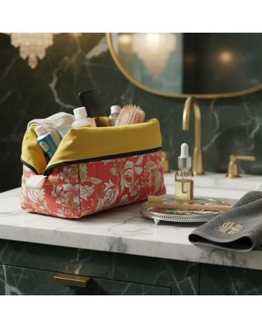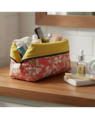 Trousse de toilette matelassée en coton fleuri et doublée en coton moutarde.