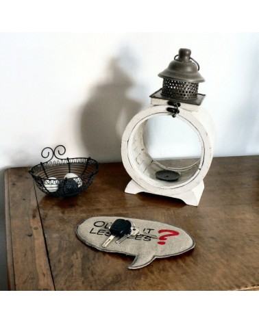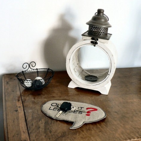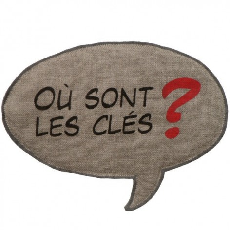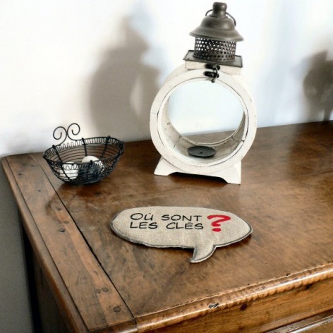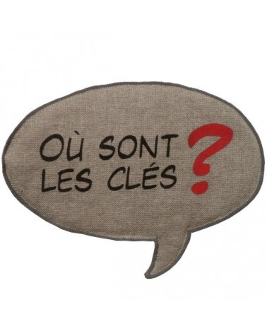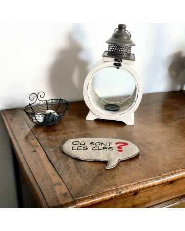 Vide-poche en lin en forme de bulle de BD, molletonné, avec l'inscription «Où sont les clés ?» peinte au pochoir.